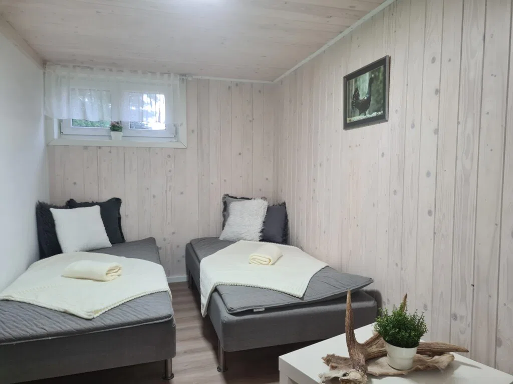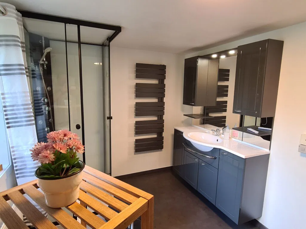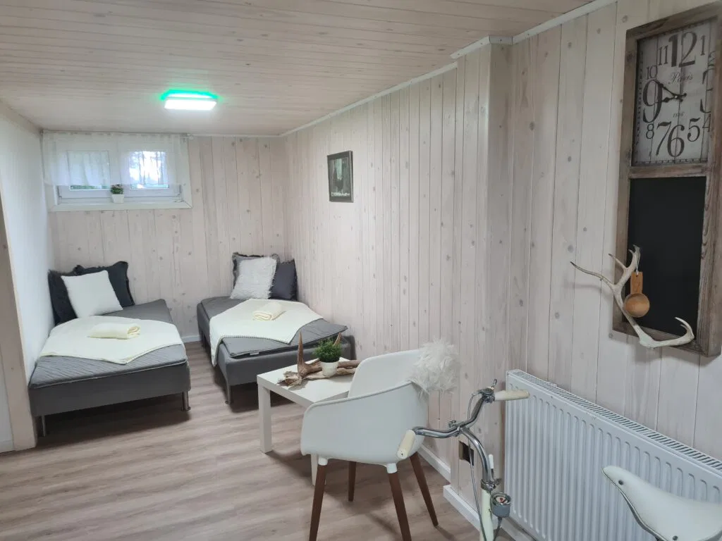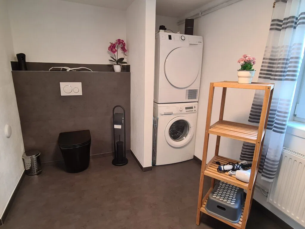 Im Untergeschoss ist das große moderne Bad mit Dusche, Waschtisch, Waschmaschine und WC sowie ein Zimmer mit 2 weiteren Betten.